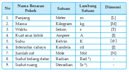 Dari satuan ini dapat ditentukan besaran-besaran pokoknya yaitu massa, panjang dan dua besaran waktu. Penggambaran suatu besaran turunan tentang besaran-besaran pokok penyusunnya seperti di atas dinamakan dimensi. Dimensi dari tujuh besaran pokok telah disusun dan digunakan sebagai dasar dimensi besaran turunan.